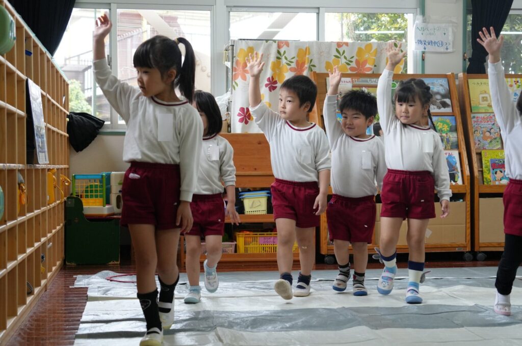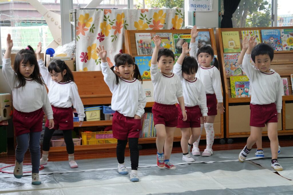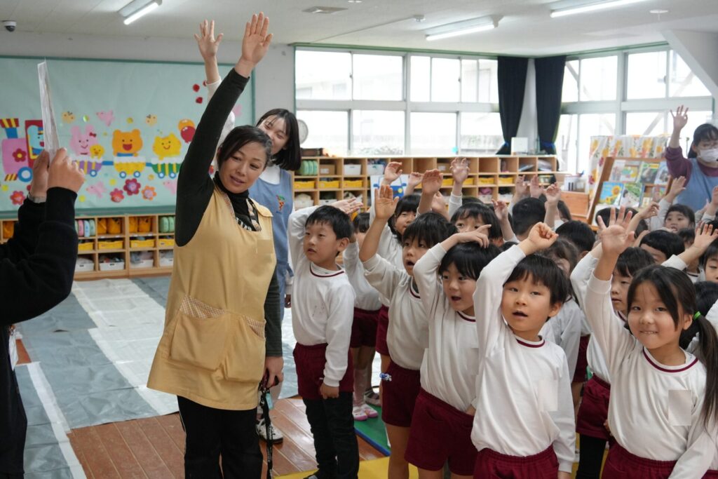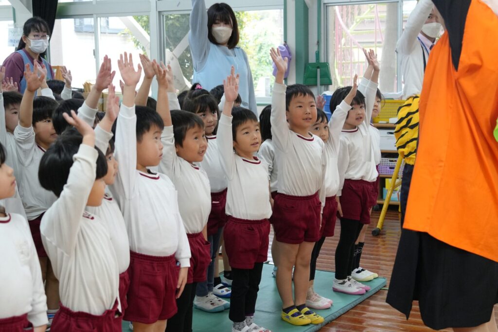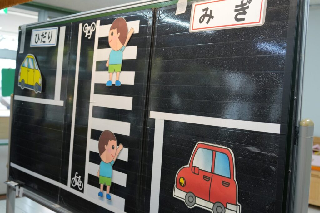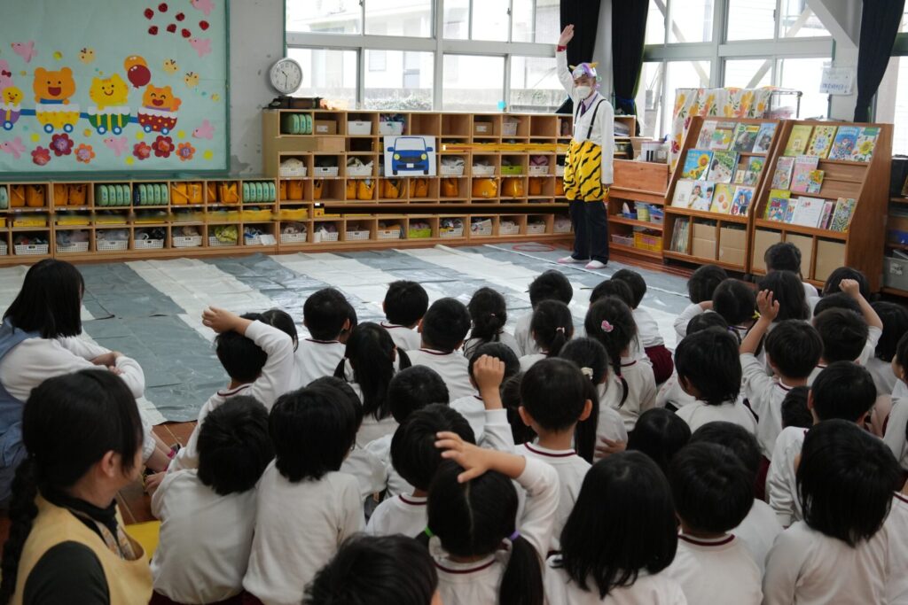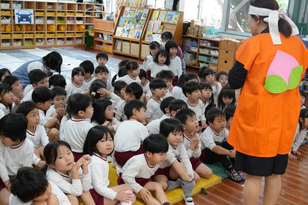 ふじぐみうめぐみ 2026年04月24日 交通安全教室🚙 ふじ・うめ組さんが 桃太郎と鬼に扮した 倉敷市の職員さんに、 横断歩道の渡り方や🚥 見通しの悪い交差点での 注意点などを分かりやすく 教えていただきました。